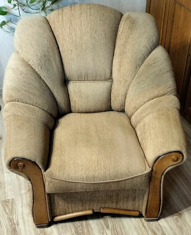 Sprzedam używane dwa fotele wypoczynkowe.Kolor beżowy, wykończenie drewniane w kolorze orzech.