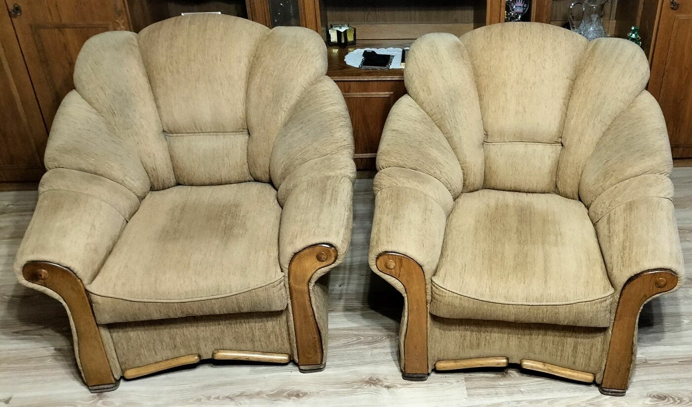 Dwa fotele wypoczynkowe kolor beżowy, drewno orzech